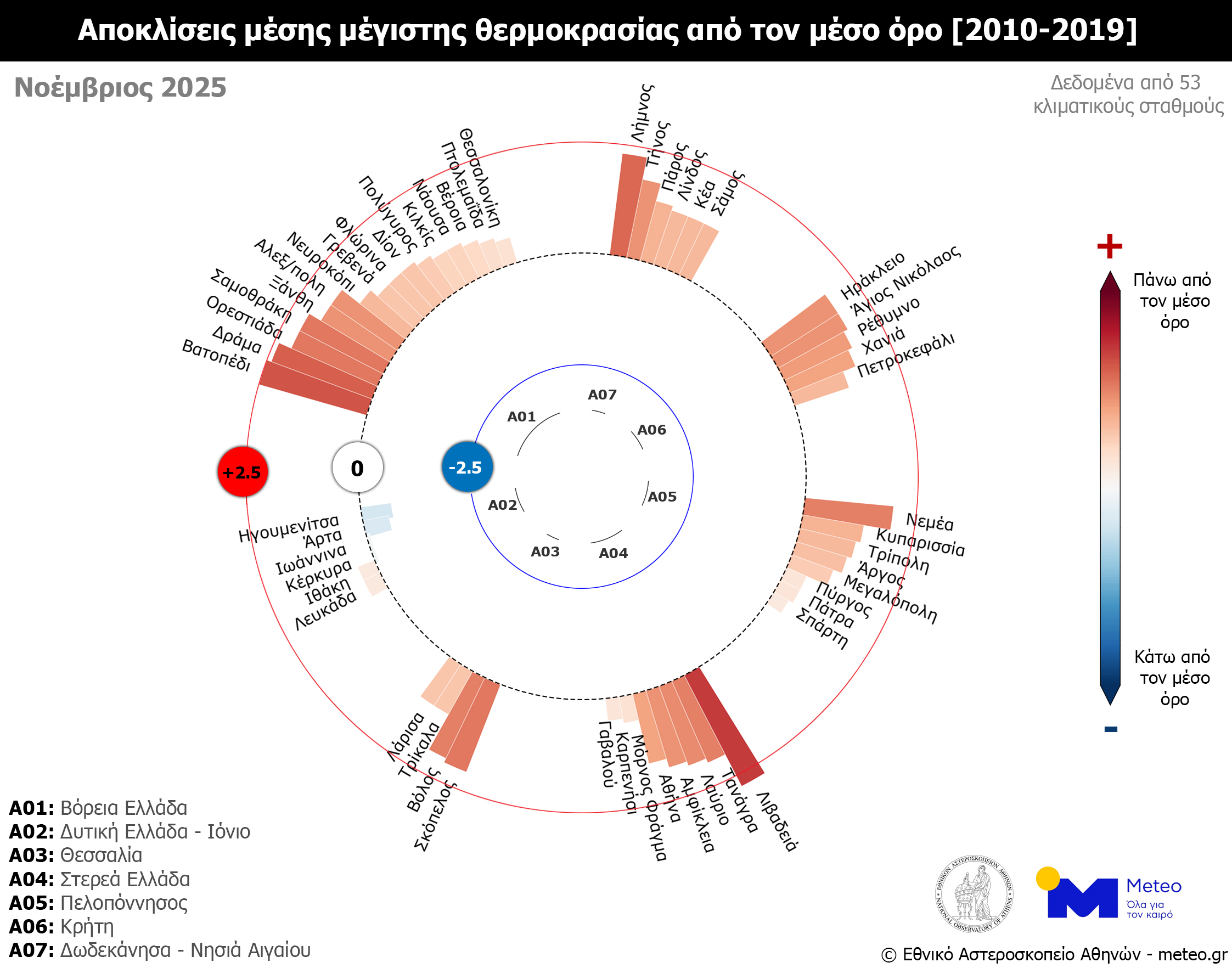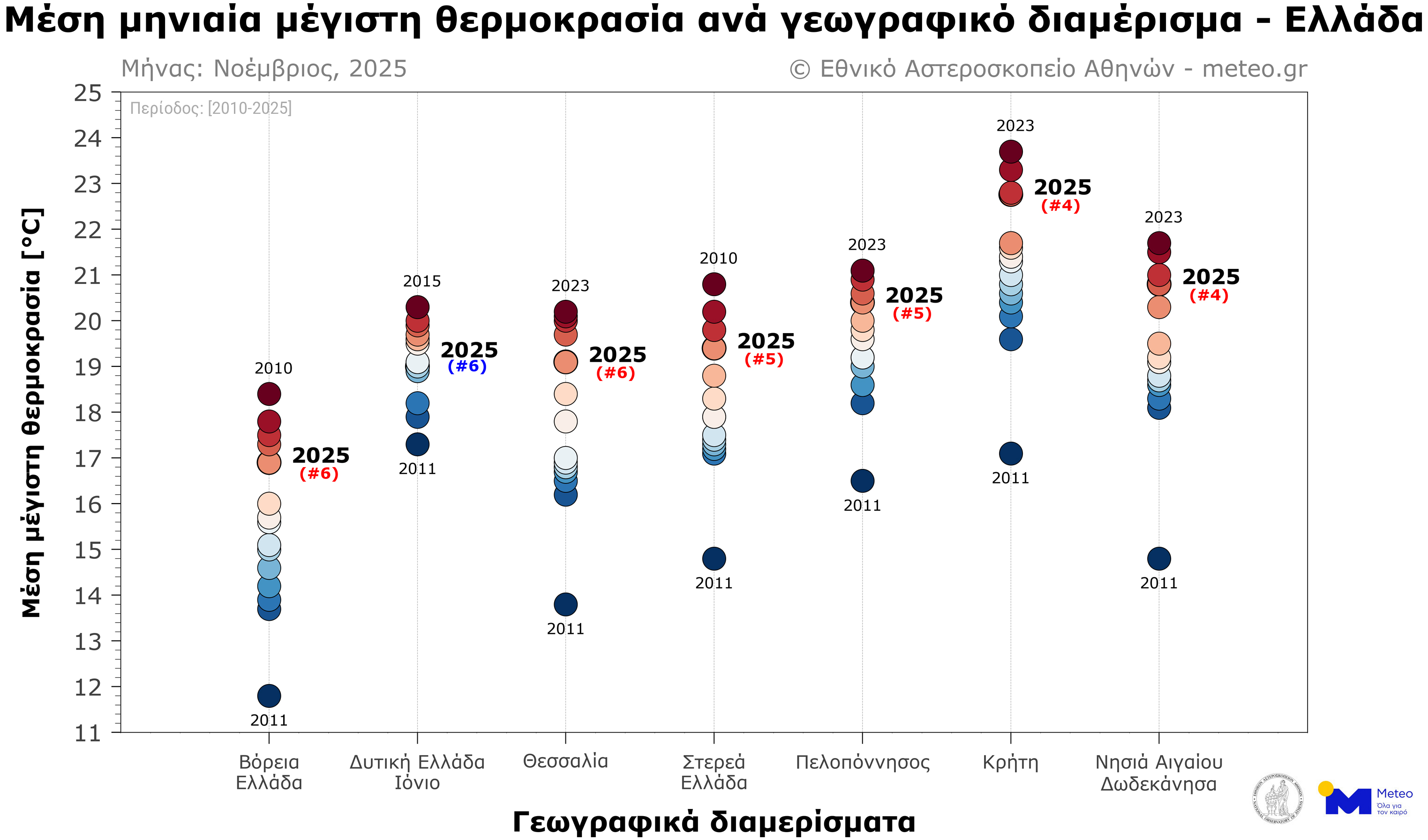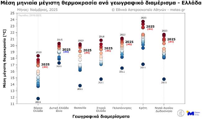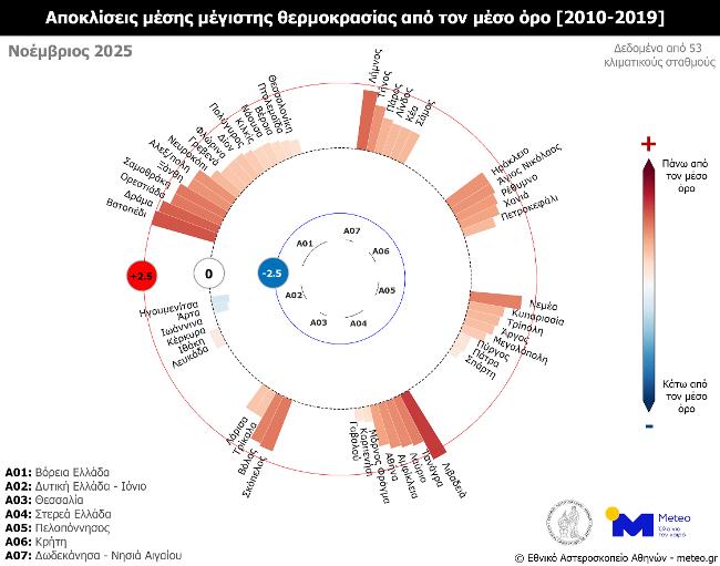 Σύμφωνα με το δίκτυο των 53 μετεωρολογικών σταθμών του meteo.gr του Εθνικού Αστεροσκοπείου Αθηνών (Ε.Α.Α.), που λειτουργούν ανελλιπώς από το 2010 έως σήμερα, τον Νοέμβριο του 2025 η μέση τιμή των μεγίστων ημερήσιων θερμοκρασιών κυμάνθηκε σε υψηλότερα για την εποχή επίπεδα σε όλα τα γεωγραφικά διαμερίσματα, εκτός από τη Δυτική Ελλάδα και τα νησιά του Ιονίου πελάγους, όπου καταγράφηκε ελαφρώς χαμηλότερη από τα κανονικά τιμή (σε σύγκριση με τον μέσο όρο της περιόδου 2010–2019).