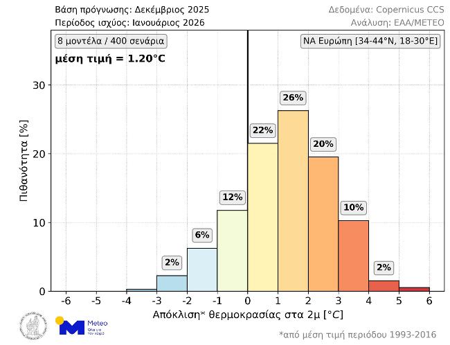 Θερμότερος του κανονικού αναμένεται να είναι ο ερχόμενος Ιανουάριος στην ΝΑ Ευρώπη (συμπεριλαμβανομένης της Ελλάδας) σύμφωνα με τις μακροπρόθεσμες προγνώσεις που εκδόθηκαν στις αρχές Δεκεμβρίου. Όπως φαίνεται στο παρακάτω γράφημα (Εικόνα 1), σύμφωνα με το 80% των διαθέσιμων σεναρίων η μέση θερμοκρασία Ιανουαρίου θα είναι υψηλότερη από τα κανονικά για την εποχή επίπεδα (περίοδος αναφοράς: 1993-2016). Συγκεκριμένα, η πιθανότητα για θετικές αποκλίσεις μεταξύ 0 και 1°C, μεταξύ 1 και 2°C και άνω των 2°C είναι 22%, 26% και 32% αντίστοιχα. Οι πιθανότητες για αρνητικές αποκλίσεις μεταξύ 0 και 1°C και άνω του 1°C είναι 12% και 8% αντίστοιχα. Η μέση τιμή των 400 σεναρίων είναι +1.2°C.