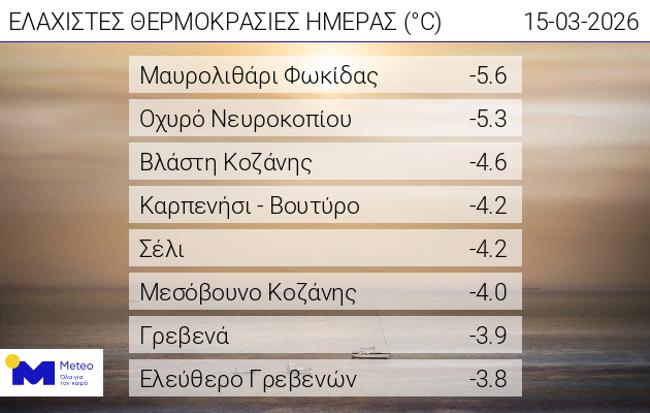 Κοντά στους -6 °C έπεσε ο υδράργυρος το πρωί της Κυριακής 15/03 στα ηπειρωτικά τμήματα της χώρας. Σύμφωνα με το δίκτυο αυτόματων μετεωρολογικών σταθμών του meteo.gr / Εθνικού Αστεροσκοπείου Αθηνών, η χαμηλότερη θερμοκρασία καταγράφηκε στο Μαυρολιθάρι Φωκίδας και ήταν ίση με -5.6 °C. Στον σχετικό πίνακα παρουσιάζονται οι 8 σταθμοί που κατέγραψαν τις χαμηλότερες θερμοκρασίες το πρωί της Κυριακής 15/03.