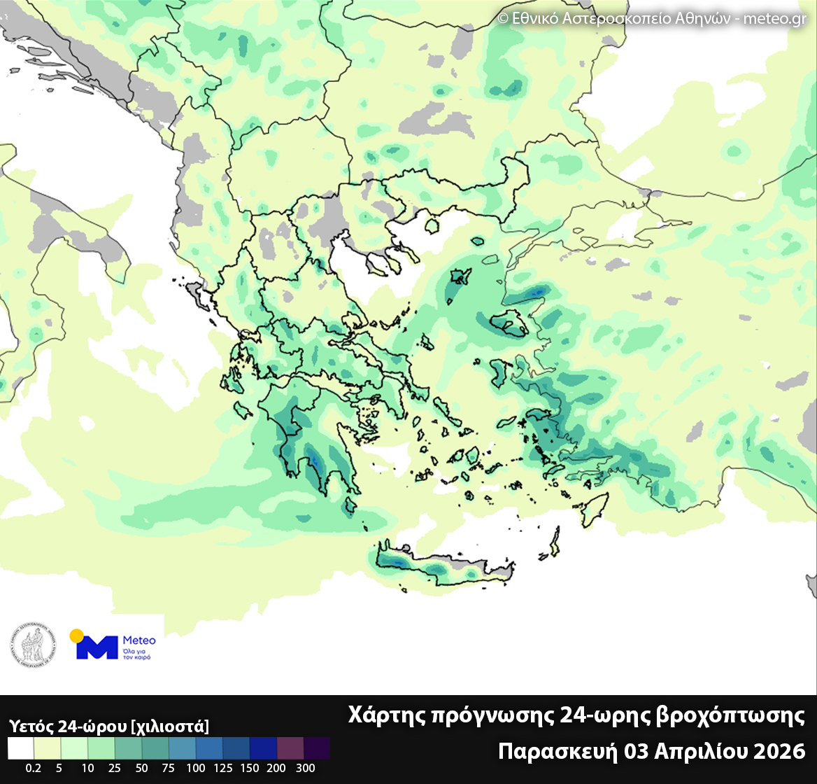 Σχήμα 1. Προγνωστικός χάρτης 24-ωρης βροχόπτωσης από τα προγνωστικά δεδομένα του Εθνικού Αστεροσκοπείου Αθηνών / meteo.gr για την Παρασκευή 03 Απριλίου 2026.