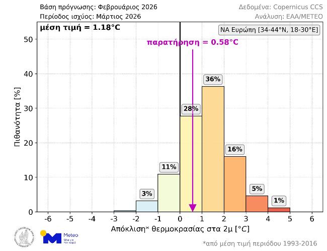 Όσον αφορά τον περασμένο Μάρτιο, η μέση θερμοκρασιακή απόκλιση στην ΝΑ Ευρώπη ήταν +0.58°C, ενώ η μέση τιμή όλων των σεναρίων της μακροπρόθεσμης πρόγνωσης που εκδόθηκε τον Φεβρουάριο του 2026 ήταν +1.18°C. Όπως φαίνεται στο παρακάτω γράφημα (Εικόνα 3), το μέγεθος της απόκλισης που παρατηρήθηκε είχε πιθανότητα 28% και ήταν το δεύτερο πιθανότερο πεδίο τιμών στην μακροπρόθεσμη πρόγνωση.