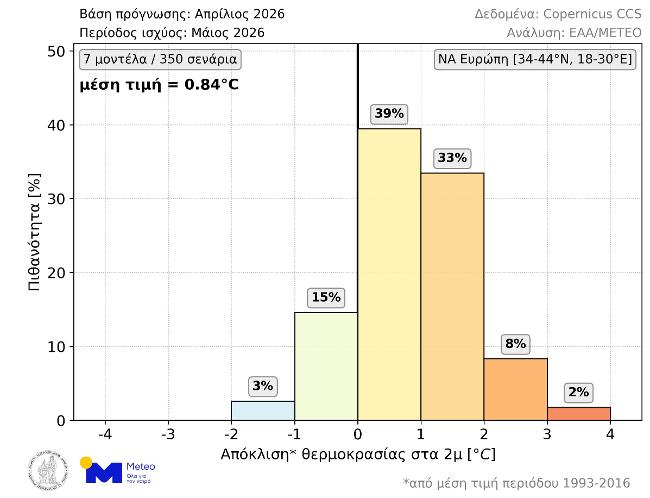 Θερμότερος του κανονικού αναμένεται να είναι ο ερχόμενος Μάιος στην ΝΑ Ευρώπη (συμπεριλαμβανομένης της Ελλάδας) σύμφωνα με τις μακροπρόθεσμες προγνώσεις που εκδόθηκαν στις αρχές Απριλίου. Όπως φαίνεται στο παρακάτω γράφημα (Εικόνα 1), σύμφωνα με το 82% των διαθέσιμων σεναρίων η μέση θερμοκρασία Μαΐου θα είναι υψηλότερη από τα κανονικά για την εποχή επίπεδα (περίοδος αναφοράς: 1993-2016). Συγκεκριμένα, η πιθανότητα για θετικές αποκλίσεις μεταξύ 0 και 1°C, μεταξύ 1 και 2°C και άνω των 2°C είναι 39%, 33% και 10% αντίστοιχα. Οι πιθανότητες για αρνητικές αποκλίσεις μεταξύ 0 και 1°C και άνω του 1°C είναι 15% και 3% αντίστοιχα. Η μέση τιμή των 350 σεναρίων είναι +0.84°C.