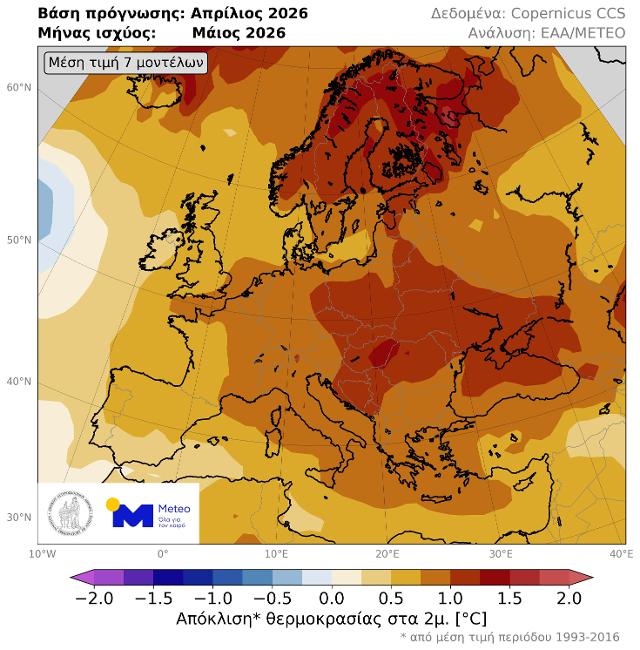 Εικόνα 2. Χάρτης απόκλισης της μέσης θερμοκρασίας Μαΐου 2026, σύμφωνα με την μέση τιμή των 350 μακροπρόθεσμων προγνώσεων που εκδόθηκαν αρχές Απριλίου.