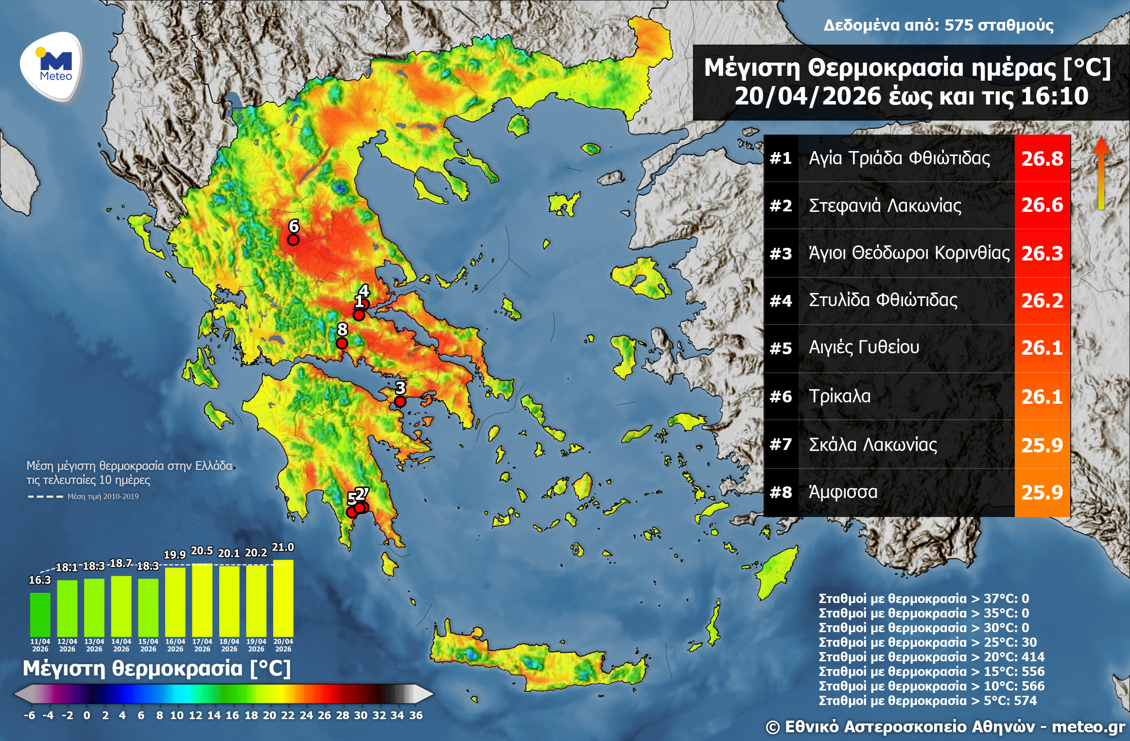 Πλησίασε τους τους 27 °C η θερμοκρασία την Δευτέρα 20/04. Η μέγιστη τιμή της καταγράφηκε από τον μετεωρολογικό σταθμό της Αγίας Τριάδας Φθιώτιδας (26.8 °C) και ακολούθησαν αυτοί της Στεφανιάς Λακωνίας (26.6 °C) και των Αγίων Θεοδώρων Κορινθίας (26.3 °C). Στον χάρτη της εικόνας που ακολουθεί παρουσιάζεται η κατανομή της μέγιστης θερμοκρασίας στη χώρα σύμφωνα με το δίκτυο αυτόματων μετεωρολογικών σταθμών του Εθνικού Αστεροσκοπείου Αθηνών / meteo.gr.