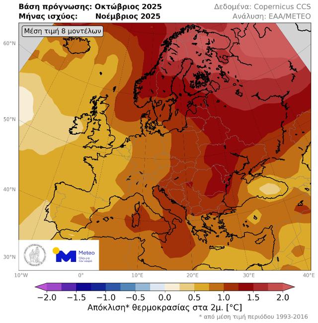 Εικόνα 2. Χάρτης απόκλισης της μέσης θερμοκρασίας Νοεμβρίου 2025, σύμφωνα με την μέση τιμή των 400 μακροπρόθεσμων προγνώσεων που εκδόθηκαν αρχές Οκτωβρίου.