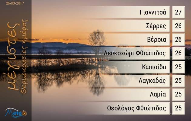 Υψηλές θερμοκρασίες σημειώθηκαν την Κυριακή 26/03 σε αρκετούς σταθμούς του δικτύου μας, όπως διακρίνεται και στον παρακάτω πίνακα.
