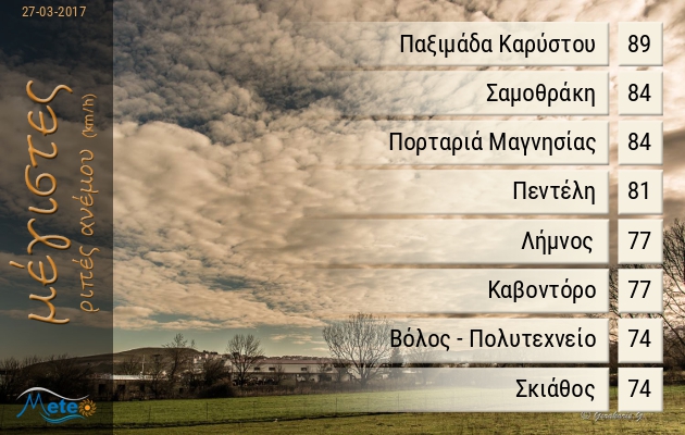 Μετά την καλοκαιρία του Σαββατοκύριακου, μεταβολή παρουσιάζει ο καιρός από τις πρωϊνές ώρες της Δευτέρας 27/03 στη χώρα, με σημαντική πτώση της θερμοκρασίας και θυελλώδεις ανέμους στα ανατολικά. Οι μεγαλύτερες ριπές που εχουν καταγράψει οι σταθμοί μας το πρωί της Δευτέρας δίνονται στον παρακάτω πίνακα.