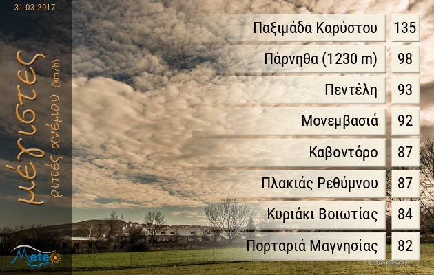 Θυελλώδεις βόρειοι άνεμοι πνέουν στα ανατολικά και νότια την Παρασκευή 31 Μαρτίου. Οι μεγαλύτερες ριπές που εχουν καταγράψει οι σταθμοί μας μέχρι το απόγευμα της Παρασκευής δίνονται στον παρακάτω πίνακα.