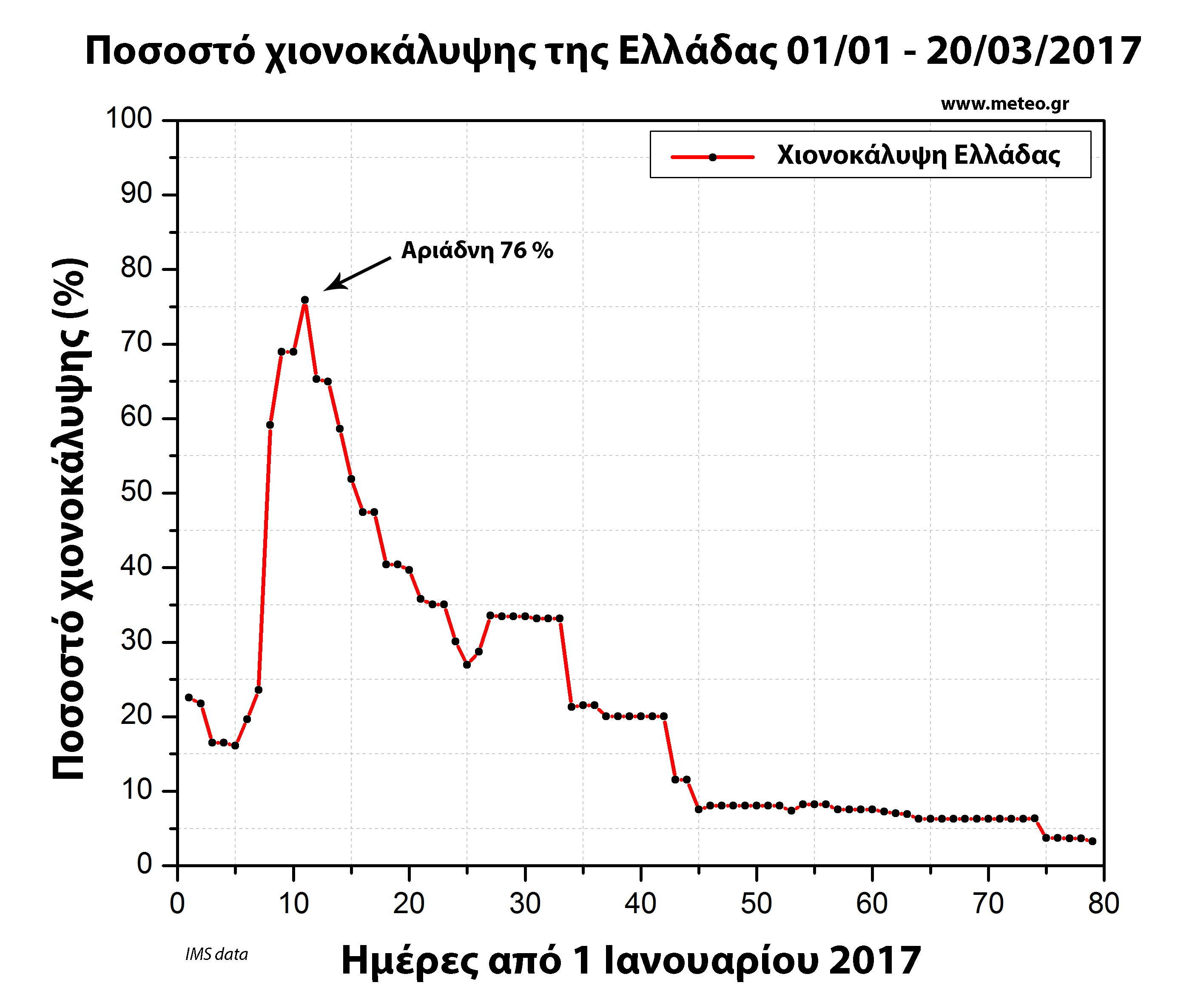 Το παρακάτω γράφημα δείχνει την πορεία της χιονοκάλυψης στη χώρα μας από 1 Ιανουαρίου έως 20 Μαρτίου 2017. Η χιονοκάλυψη εκφράζεται σε ποσοστό (κατακόρυφος άξονας) επί της συνολικής έκτασης της χώρα μας τις πρώτες 79 μέρες του 2017 (οριζόντιος άξονας). Τα δεδομένα προέρχονται από δορυφορικές εκτιμήσεις με οριζόντια ανάλυση 1 km, διαθέσιμα ημερησίως από το Εθνικό Κέντρο Χιονιού και Πάγου των ΗΠΑ (NSIDC).
