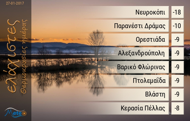 Στους -18 βαθμούς έπεσε η θερμοκρασία το πρωί της Παρασκευής 27/01 στο Νευροκόπι Δράμας, ενώ πολύ χαμηλές θερμοκρασίες καταγράφησαν σε πολλές ηπειρωτικές περιοχές, όπως διακρίνεται και στον παρακάτω πίνακα των σταθμών μας.