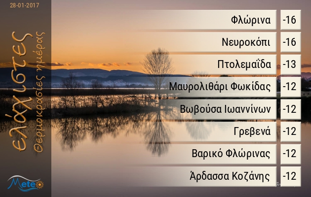 Στους -16 βαθμούς έπεσε η θερμοκρασία το πρωί του Σαββάτου 28/01 στους σταθμούς του Αστεροσκοπείου Αθηνών στη Φλώρινα και στο Νευροκόπι Δράμας, ενώ πολύ χαμηλές θερμοκρασίες καταγράφησαν σε πολλές ηπειρωτικές περιοχές, όπως διακρίνεται και στον παρακάτω πίνακα των σταθμών μας.