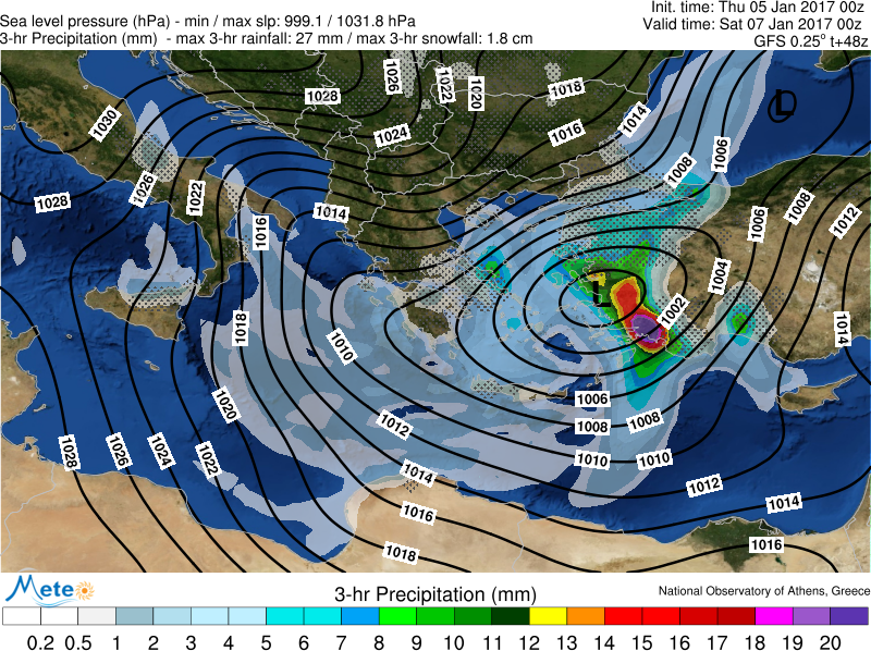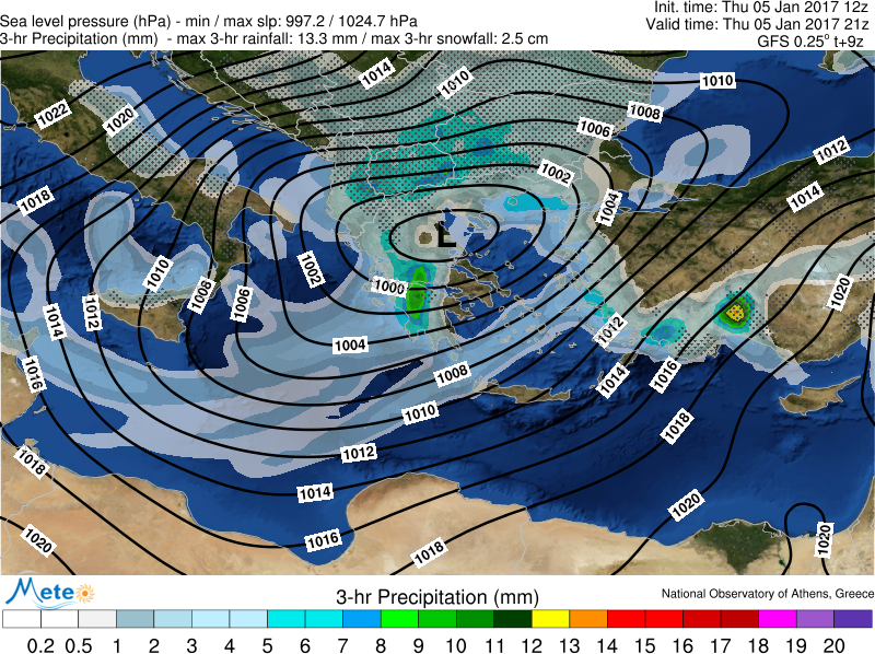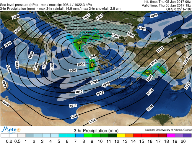 Χάρτης 4: Βαρομετική πίεση, βροχοπτώσεις και χιονοπτώσεις το βράδυ της Παρασκευής 05/01