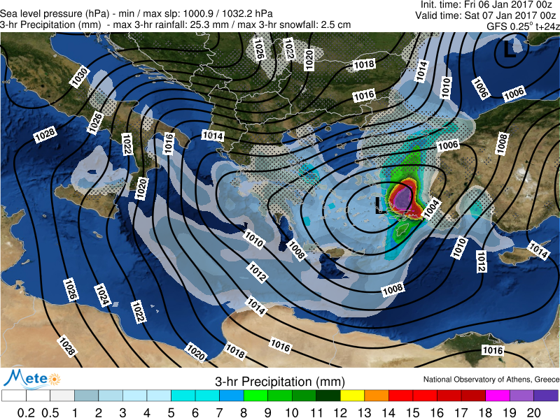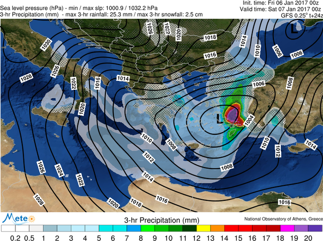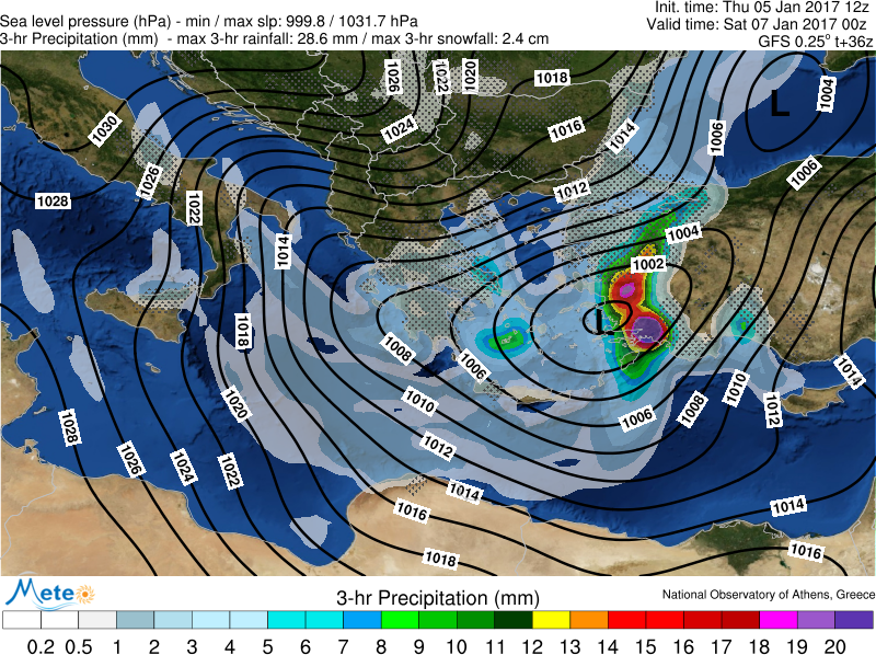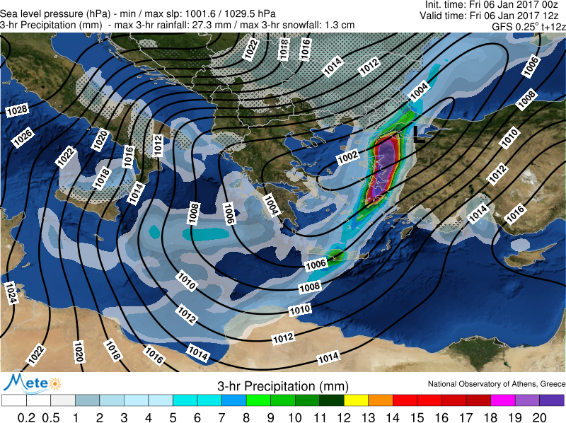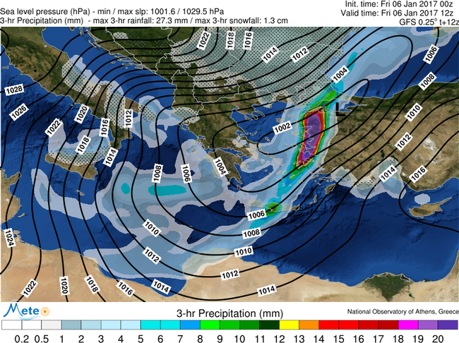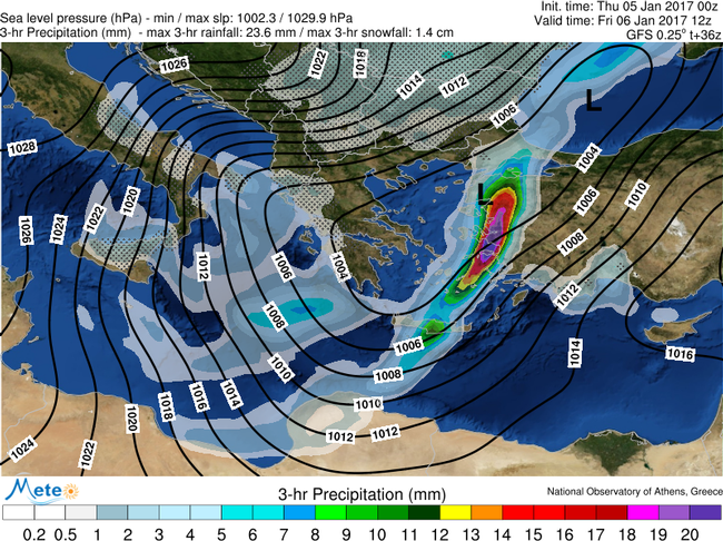 Τις μεσημεριανές/απογευματινές ώρες της Παρασκευής 06/01, καθώς το χαμηλό θα έχει μετακινηθεί προς την Τουρκία, θα υπάρχει πρόσκαιρη βελτίωση του καιρού σε μεγάλο μέρος της ώρας, με εξαίρεση λίγα φαινόμενα στα δυτικά και πολύ ισχυρές βροχοπτώσεις στην Κρήτη, στις Κυκλάδες και κυρίως στα νησιά του Ανατ. Αιγαίου, με μεγάλη πιθανότητα εκδήλωσης πλημμυρικών επεισοδίων στα νησιά του Ανατ. Αιγαίου (Χάρτης 3).