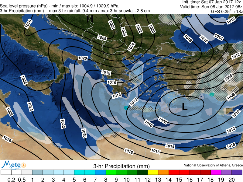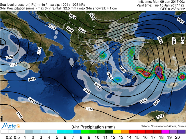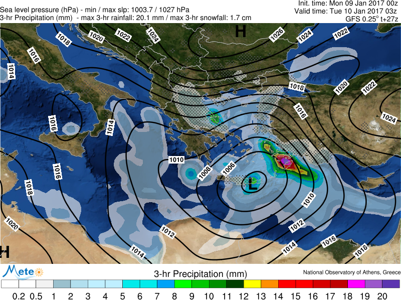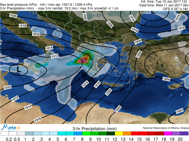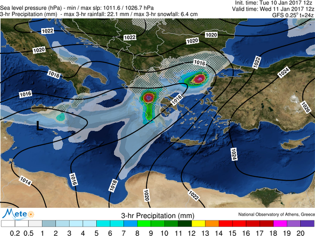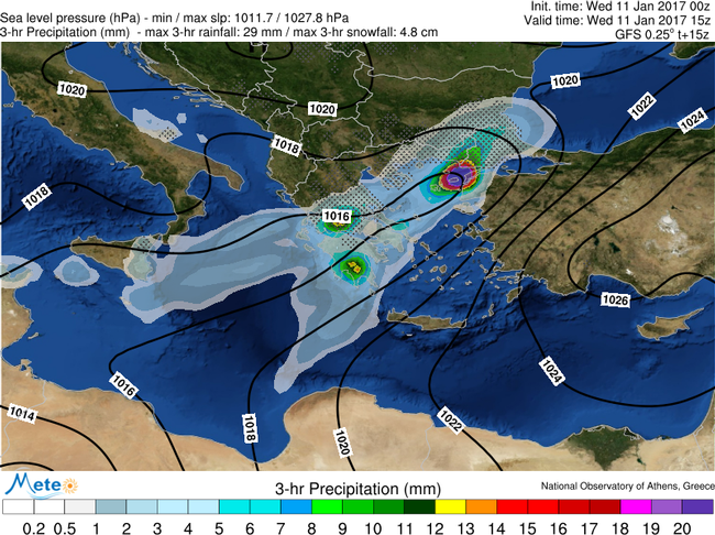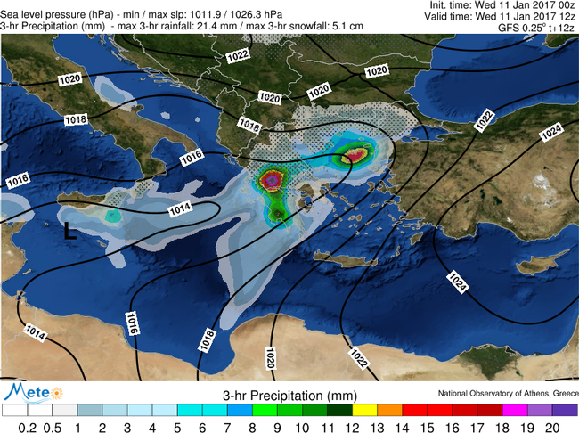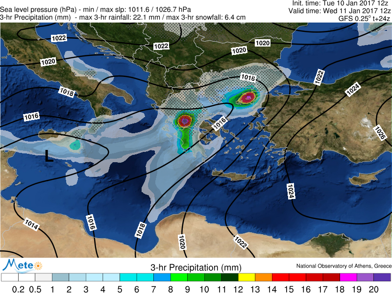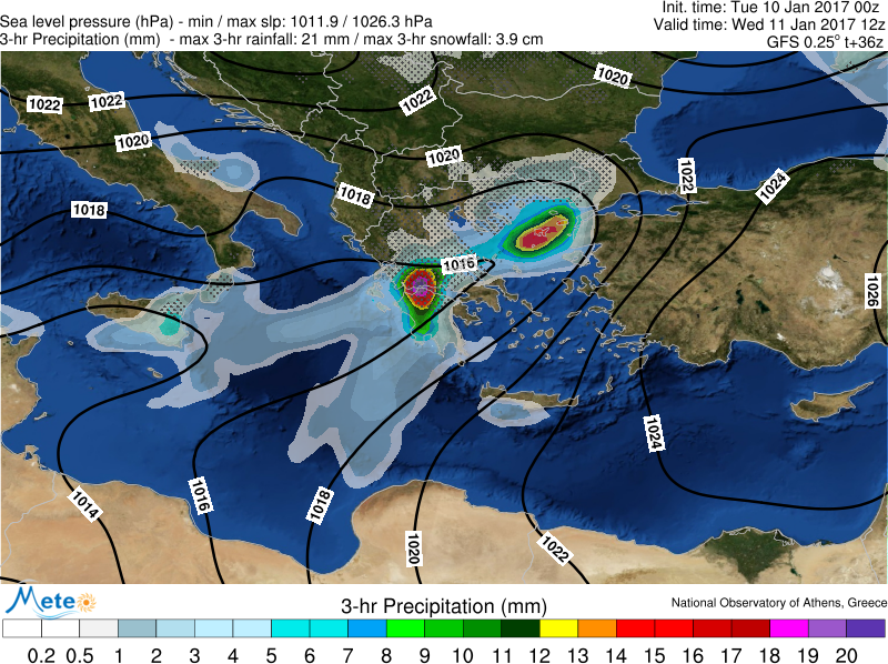 Οι παρακάτω χάρτες δίνουν την κατανομή της πίεσης και της βροχόπτωσης/χιονόπτωσης με τις χιονοπτώσεις να σημειώνονται με στίγματα (αριστερά το μεσημέρι της Τετάρτης και δεξιά το απόγευμα της Τετάρτης):