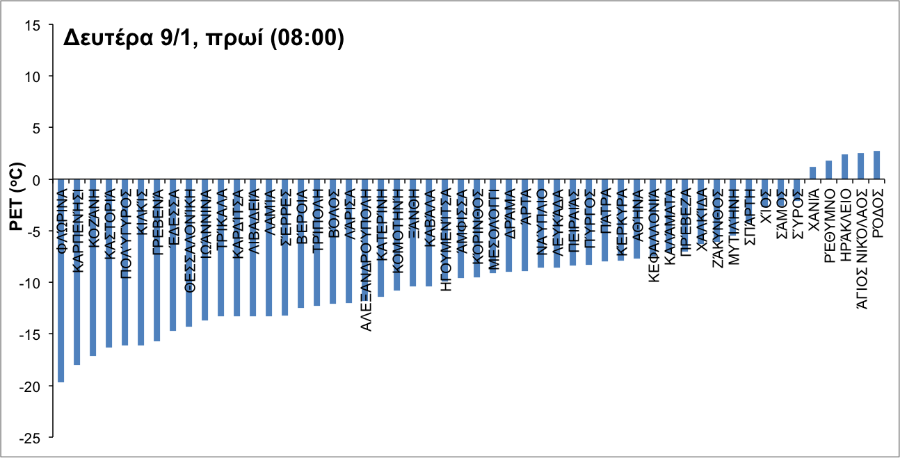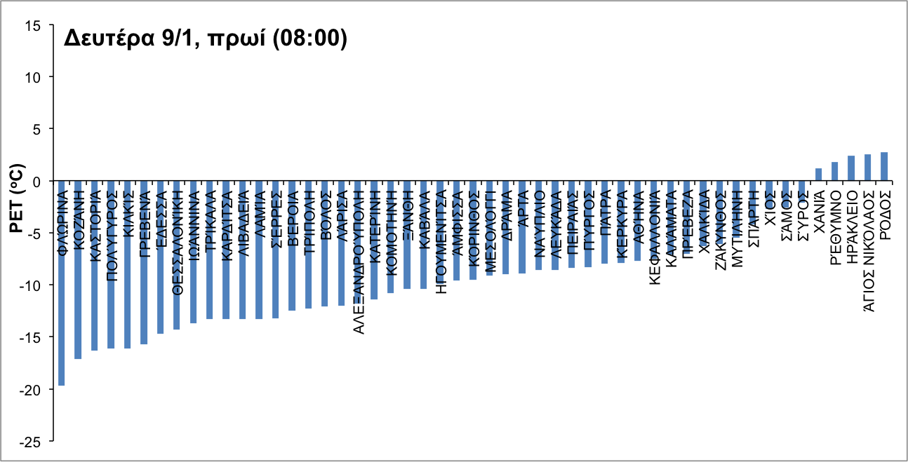 Σε συνέχεια της εκτίμησης της θερμοφυσιολογικής επιβάρυνσης εξαιτίας της επικράτησης ακραία χαμηλών θερμοκρασιών στη χώρα μας, ο επόμενος πίνακας συνοψίζει τις επικρατούσες βιομετεωρολογικές συνθήκες σε επιλεγμένους σταθμούς του δικτύου του meteo.gr/ΕΑΑ στη Βόρεια Ελλάδα, το μεσημέρι της Κυριακής 8 Ιανουαρίου 2017. Για την βιομετεωρολογική αποτίμηση εφαρμόστηκε το μοντέλο RayMan, τροφοδοτούμενο από τις μετρήσεις των αντίστοιχων μετεωρολογικών σταθμών. Στο πίνακα παρουσιάζονται οι τιμές της θερμοκρασίας και της αντίστοιχης φυσιολογικά ισοδύναμης θερμοκρασίας (Physiologically Equivalent Temperature – PET) για το μεσημέρι της Κυριακής 8 Ιανουαρίου 2017.