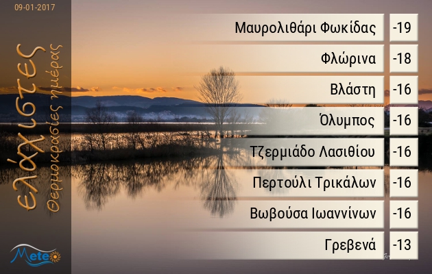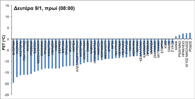 Οπως αναμενόταν, πολυ χαμηλές θερμοκρασίες σημειώθηκαν στους σταθμούς του meteo.gr/EAA το πρωί της Δευτέρας 09/01, όπως διακρίνεται και στον παρακάτω πίνακα. Σημειώνουμε την ιδιαίτερα χαμηλή θερμοκρασία στο οροπέδιο Λασηθίου στην Κρήτη (Τζερμιάδο). Ο Πίνακας δεν περιλαμβάνει τις τιμές από τους σταθμούς των Χ/Κ, όπου στο Καϊμάκτσαλαν το πρωί η ελάχιστη θερμοκρασία ήταν -20.7 βαθμοί.