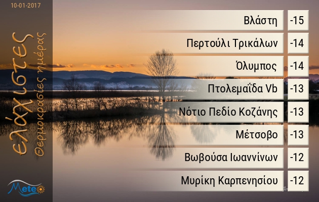 Πολύ χαμηλές θερμοκρασίες σημειώθηκαν στους σταθμούς του meteo.gr/EAA το πρωί της Τρίτης 10/01, όπως διακρίνεται και στον παρακάτω πίνακα. Ο Πίνακας δεν περιλαμβάνει τις τιμές από τους σταθμούς των Χ/Κ, όπου στο Καϊμάκτσαλαν το πρωί η ελάχιστη θερμοκρασία ήταν -18.8 βαθμοί.