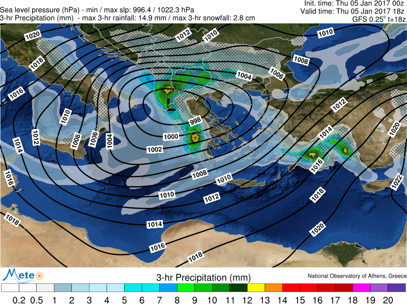 Χάρτης 1: Βαρομετική πίεση, βροχοπτώσεις και χιονοπτώσεις το απόγευμα της Πέμπτης 05/01