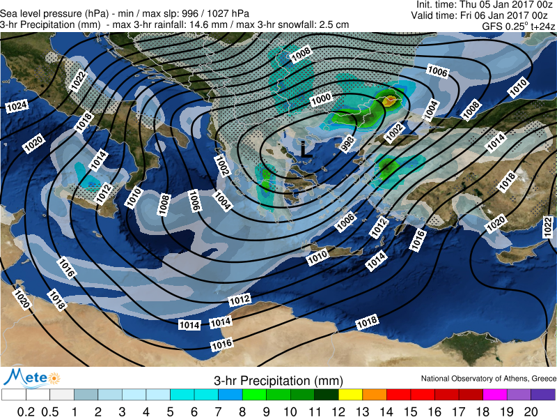 Χάρτης 2: Βαρομετική πίεση, βροχοπτώσεις και χιονοπτώσεις τη νύχτα της Πέμπτης προς Παρασκευή 06/01