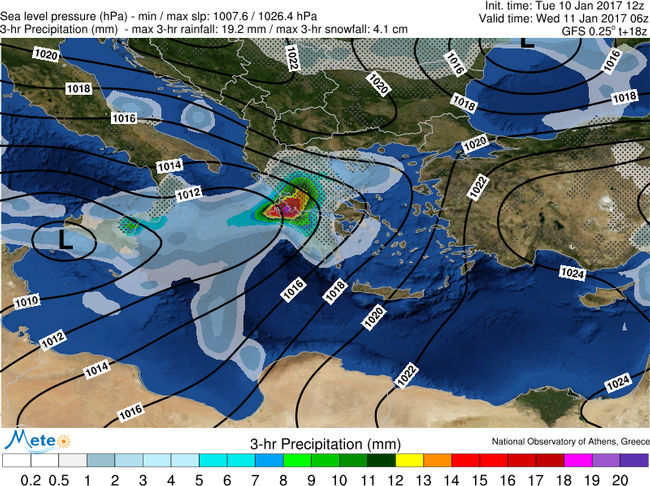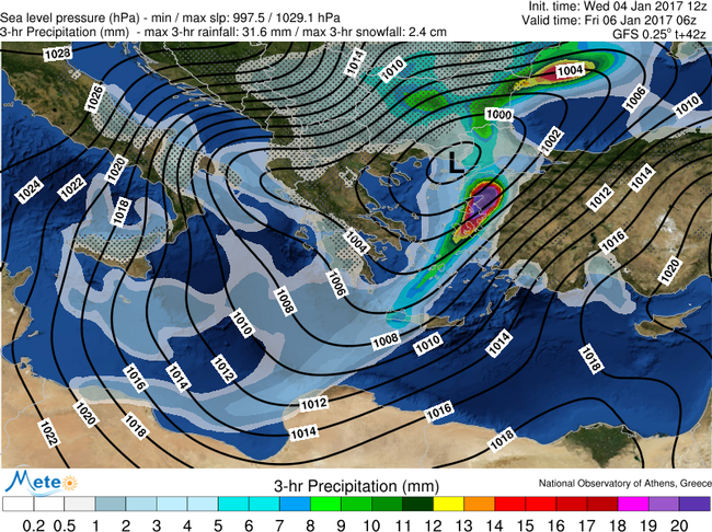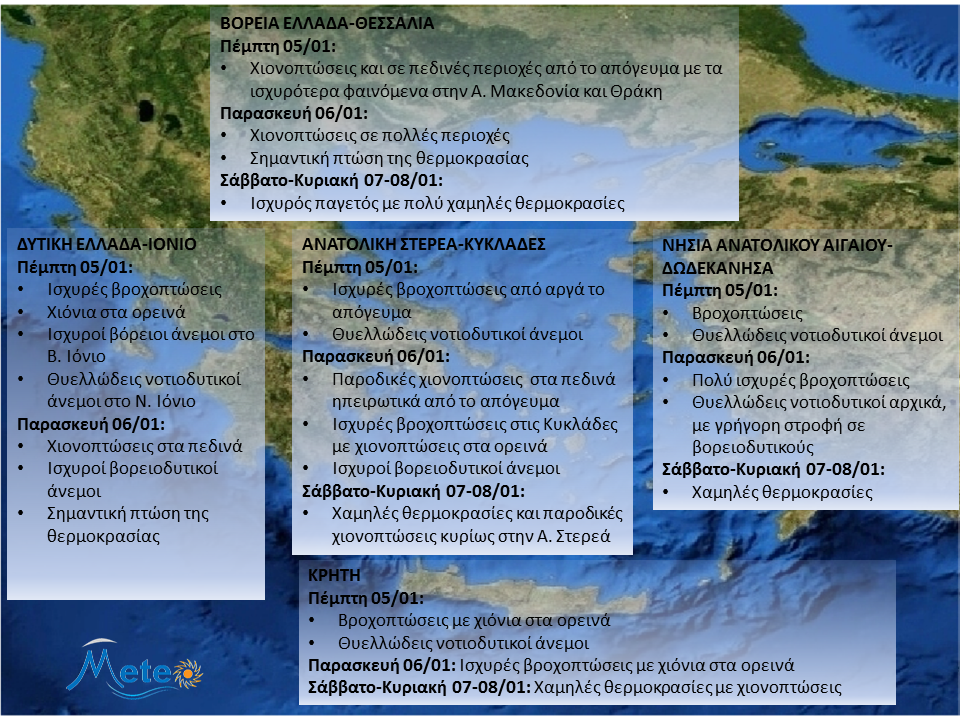 Τις βραδινές ώρες της Παρασκευής 06/01, νέο βαρομετρικό χαμηλό στην περιοχή του Αιγαίου αναμένεται να προκαλέσει χιονοπτώσεις στην ανατολική και νότια ηπειρωτική χώρα, ενώ θα συνεχιστούν οι ισχυρές βροχές στα νησιά του Ανατ. Αιγαίου, στην Κρήτη και στα Δωδεκάνησα (Χάρτης 4). Τα φαινόμενα θα έχουν υποχωρήσει στη Β. Ελλάδα, όπου θα επικρατούν όμως πολύ χαμηλές θερμοκρασίες.