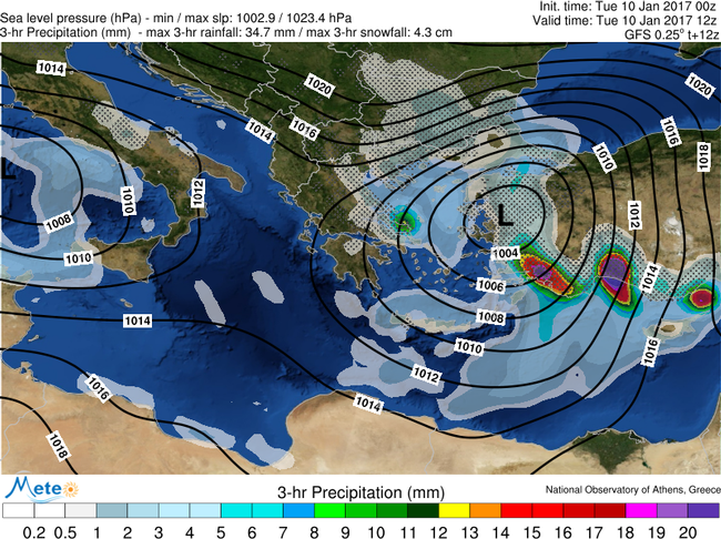 Οι παρακάτω χάρτες δίνουν την κατανομή της πίεσης και της βροχόπτωσης/χιονόπτωσης με τις χιονοπτώσεις να σημειώνονται με στίγματα (αριστερά το μεσημέρι της Τρίτης και δεξιά το μεσημέρι της Τετάρτης):