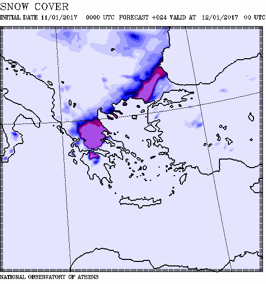 Τέλος, στον παρακάτω χάρτη δίνονται οι περιοχές στις οποίες αναμένεται να χιονίσει (και να υπάρξει νέα χιονόστρωση) μέχρι το βράδυ της Τετάρτης: