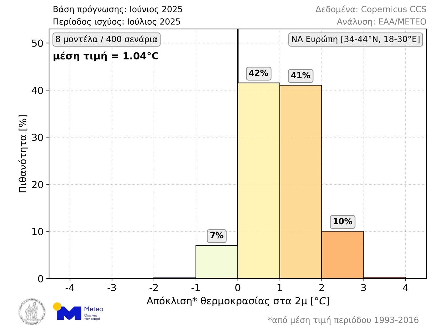 Θερμότερος του κανονικού αναμένεται να είναι ο ερχόμενος Ιούλιος στην ΝΑ Ευρώπη (συμπεριλαμβανομένης της Ελλάδας) σύμφωνα με τις μακροπρόθεσμες προγνώσεις που εκδόθηκαν μέσα στον Ιούνιο. Όπως φαίνεται στο παρακάτω γράφημα (Εικόνα 1), σύμφωνα με το 93% των διαθέσιμων σεναρίων η μέση θερμοκρασία Ιουλίου θα είναι υψηλότερη από τα κανονικά για την εποχή επίπεδα (περίοδος αναφοράς: 1993-2016). Συγκεκριμένα, η πιθανότητα για θετικές αποκλίσεις μεταξύ 0 και 1°C, μεταξύ 1 και 2°C και άνω των 2°C είναι 42%, 41% και 10% αντίστοιχα. Οι πιθανότητες για αρνητικές αποκλίσεις μεταξύ 0 και 1°C είναι 7%. Η μέση τιμή των 400 σεναρίων είναι +1.04°C. Όσον αφορά την ευρωπαϊκή ήπειρο συνολικά, ο χάρτης της Εικόνας 2 απεικονίζει την απόκλιση της θερμοκρασίας Ιουλίου με βάση την μέση τιμή των 400 σεναρίων. Όπως προκύπτει, θετικές αποκλίσεις αναμένονται σε όλη την ήπειρο, με τις μεγαλύτερες τιμές να εντοπίζονται σε κεντρική και ανατολική Ευρώπη.