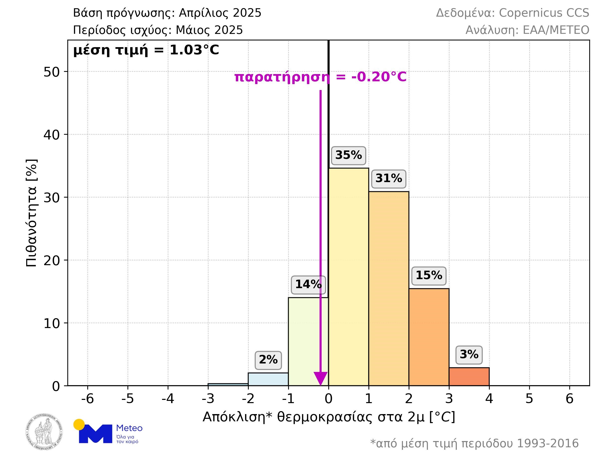 Όσον αφορά τον περασμένο Μάιο, η μέση θερμοκρασιακή απόκλιση στην ΝΑ Ευρώπη ήταν -0.20°C, ενώ η μέση τιμή όλων των σεναρίων της μακροπρόθεσμης πρόγνωσης που εκδόθηκε τον Απρίλιο του 2025 ήταν +1.03°C. Όπως φαίνεται στο παρακάτω γράφημα (Εικόνα 3), το μέγεθος της απόκλισης που παρατηρήθηκε είχε πιθανότητα 14% και ήταν το 4ο πιθανότερο πεδίο τιμών στην μακροπρόθεσμη πρόγνωση.
