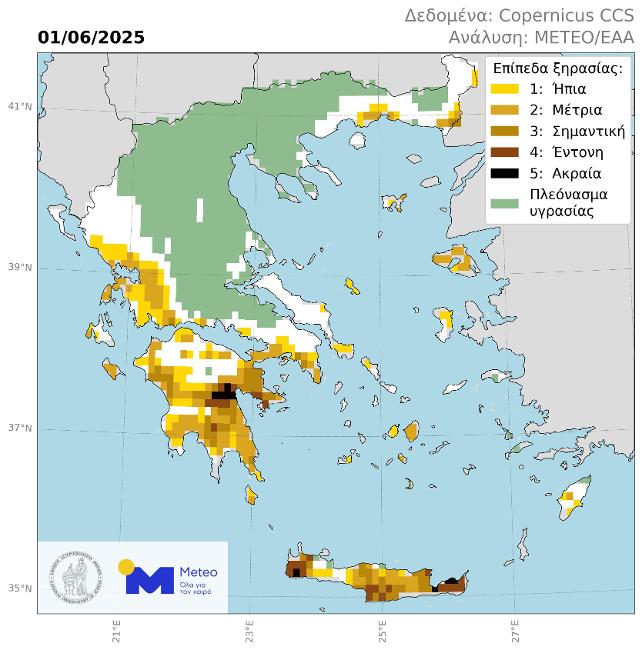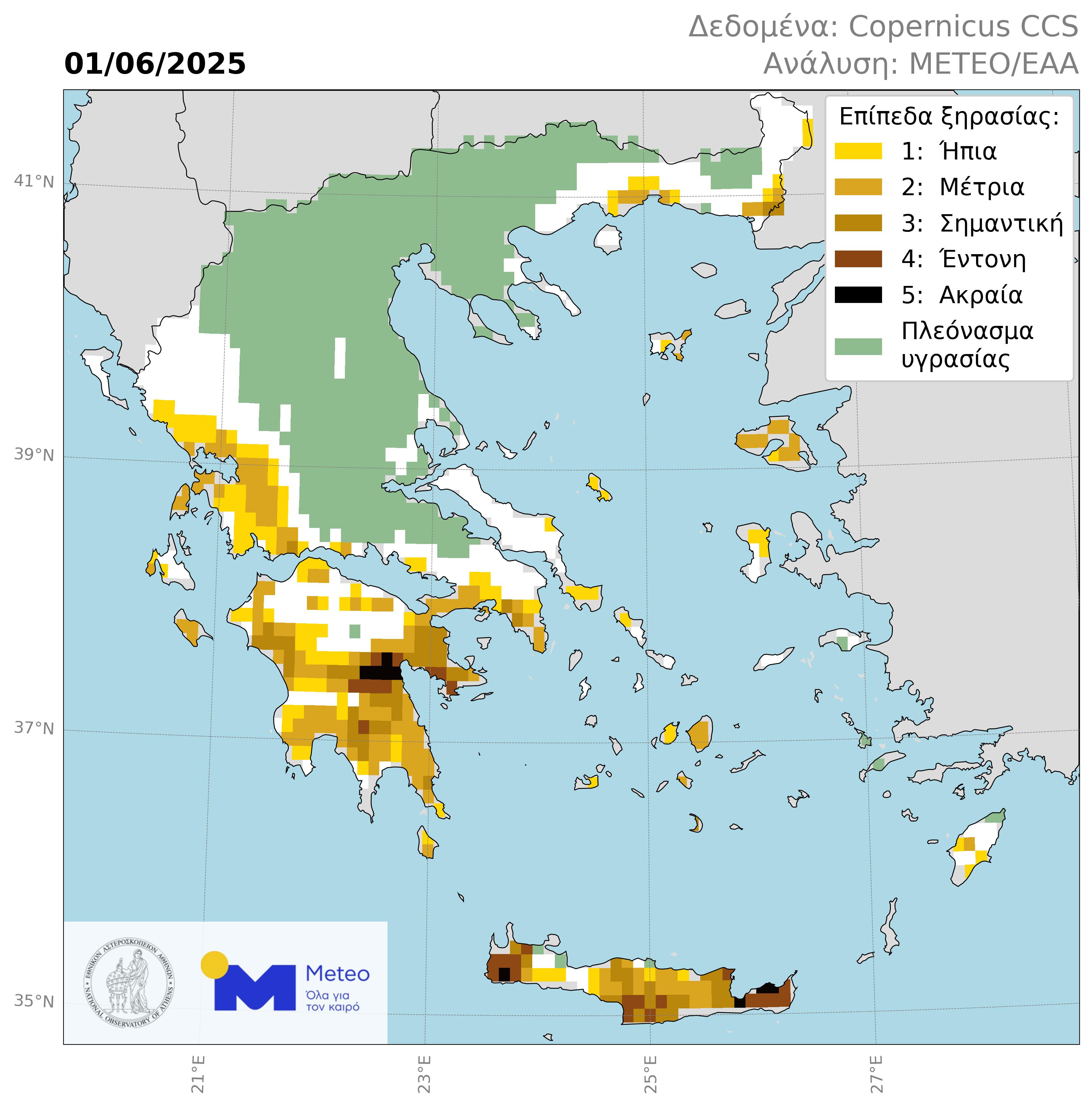 Στον παρακάτω χάρτη απεικονίζεται ο δείκτης ξηρασίας στην Ελλάδα την 1η Ιουλίου 2025, σύμφωνα με την ανάλυση της ομάδας ΜΕΤΕΟ του ΕΑΑ. Όπως προκύπτει, μεγάλο μέρος της Κρήτης, της Πελοποννήσου, της δυτικής Στερεάς Ελλάδας και της Θράκης βρίσκονται σε συνθήκες ξηρασίας. Από έντονη ή ακραία ξηρασία (επίπεδα 4 και 5) πλήττονται αρκετές περιοχές στους νομούς Χανίων, Ηρακλείου, Λασιθίου, Αρκαδίας, Αργολίδας, Μεσσηνίας, Ηλείας και Λέσβου. Μετά τις ιδιαίτερα ψηλές θερμοκρασίες και χαμηλές βροχοπτώσεις του Ιουνίου, σχεδόν το σύνολο της χώρας βρίσκεται σε υψηλότερο για την εποχή επίπεδο ξηρασίας σε σχέση με τις αρχές Ιουνίου.