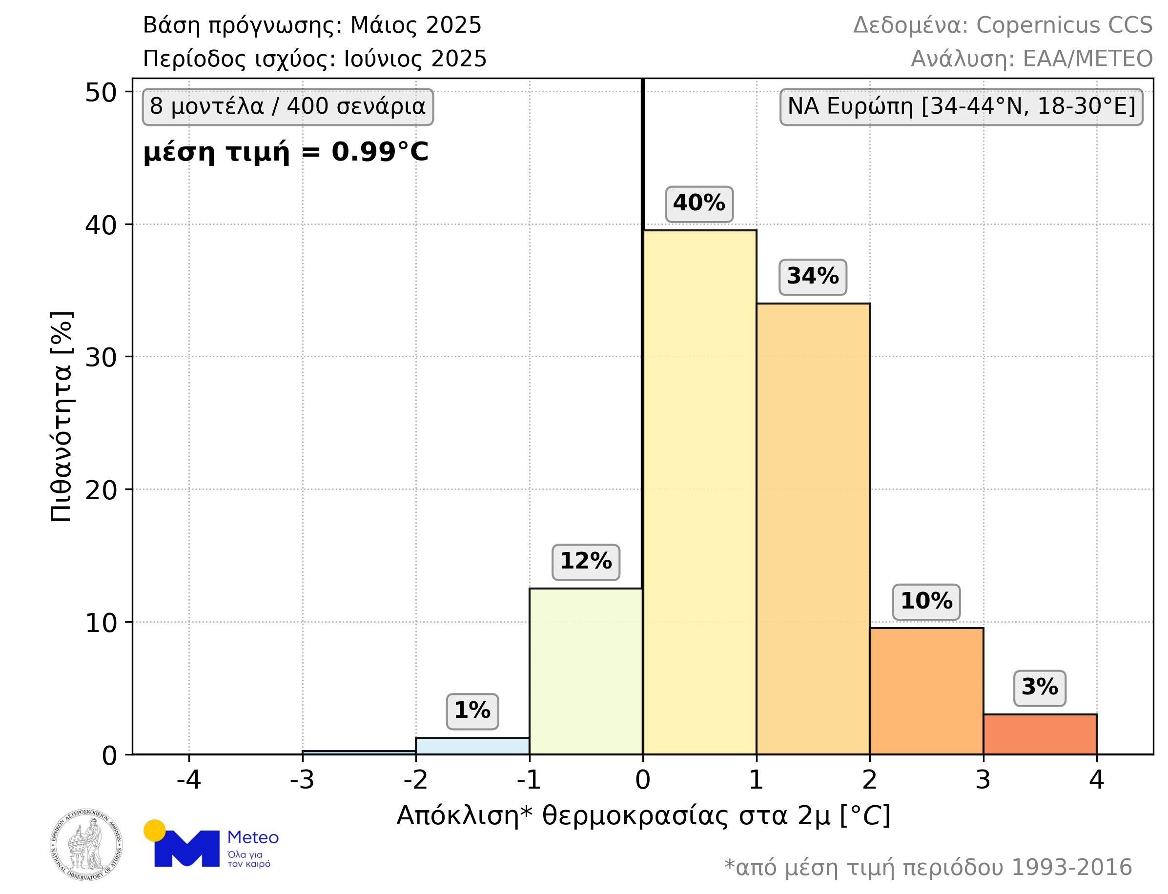 Θερμότερος του κανονικού αναμένεται να είναι ο ερχόμενος Ιούνιος στην ΝΑ Ευρώπη (συμπεριλαμβανομένης της Ελλάδας) σύμφωνα με τις μακροπρόθεσμες προγνώσεις που εκδόθηκαν μέσα στον Μάιο. Όπως φαίνεται στο παρακάτω γράφημα, σύμφωνα με το 87% των διαθέσιμων σεναρίων η μέση θερμοκρασία Ιουνίου θα είναι υψηλότερη από τα κανονικά για την εποχή επίπεδα (περίοδος αναφοράς: 1993-2016). Συγκεκριμένα, η πιθανότητα για θετικές αποκλίσεις μεταξύ 0 και 1°C, μεταξύ 1 και 2°C και άνω των 2°C είναι 40%, 34% και 13% αντίστοιχα. Οι πιθανότητες για αρνητικές αποκλίσεις μεταξύ 0 και 1°C και άνω του 1°C είναι 12% και 1% αντίστοιχα. Η μέση τιμή των 400 σεναρίων είναι +0.99°C.