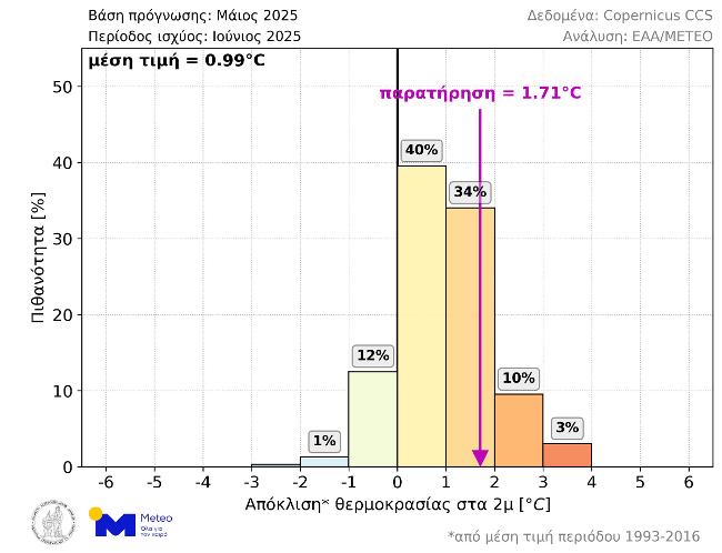 Όσον αφορά τον περασμένο Ιούνιο, η μέση θερμοκρασιακή απόκλιση στην ΝΑ Ευρώπη ήταν +1.71°C, ενώ η μέση τιμή όλων των σεναρίων της μακροπρόθεσμης πρόγνωσης που εκδόθηκε τον Μάιο του 2025 ήταν +0.99°C. Όπως φαίνεται στο παρακάτω γράφημα (Εικόνα 3), το μέγεθος της απόκλισης που παρατηρήθηκε είχε πιθανότητα 34% και ήταν το 2ο πιθανότερο πεδίο τιμών στην μακροπρόθεσμη πρόγνωση.