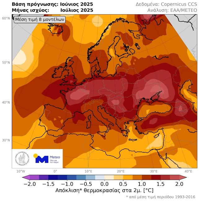Εικόνα 2. Χάρτης απόκλισης της μέσης θερμοκρασίας Ιουλίου 2025 από τη μέση τιμή του 1993-2016, σύμφωνα με την μέση τιμή των 400 μακροπρόθεσμων προγνώσεων που εκδόθηκαν αρχές Ιουνίου.