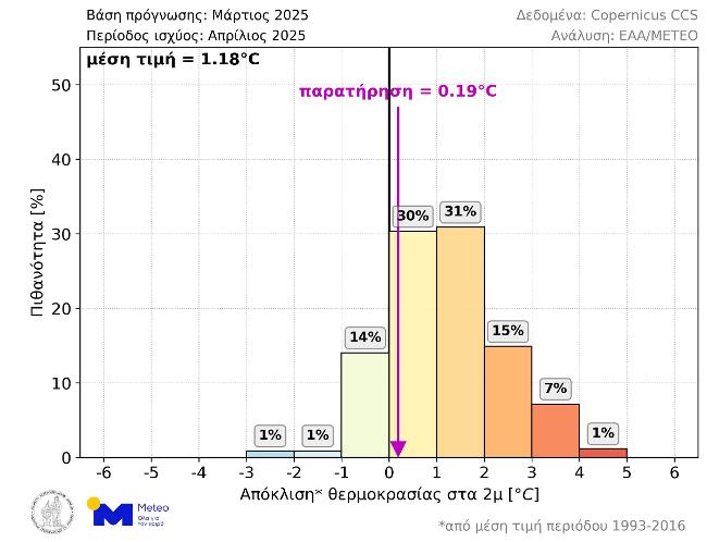 Όσον αφορά τον περασμένο Απρίλιο, η μέση θερμοκρασιακή απόκλιση στην ΝΑ Ευρώπη ήταν +0.19°C, ενώ η μέση τιμή όλων των σεναρίων της μακροπρόθεσμης πρόγνωσης που εκδόθηκε τον Μάρτιο του 2025 ήταν +1.18°C. Όπως φαίνεται στο παρακάτω γράφημα, το μέγεθος της απόκλισης που παρατηρήθηκε είχε πιθανότητα 30% και ήταν το 2ο πιθανότερο πεδίο τιμών στην μακροπρόθεσμη πρόγνωση.