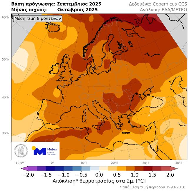 Συνολικά για την ευρωπαϊκή ήπειρο, ο χάρτης της Εικόνας 2 απεικονίζει την απόκλιση της μέσης θερμοκρασίας Οκτωβρίου με βάση την μέση τιμή των 400 σεναρίων. Όπως προκύπτει, θετικές αποκλίσεις αναμένονται σε όλη την ήπειρο, με τις μεγαλύτερες τιμές να εντοπίζονται στην ανατολική και κυρίως βορειοανατολική Ευρώπη όπου ξεπερνούν τον +1°C.