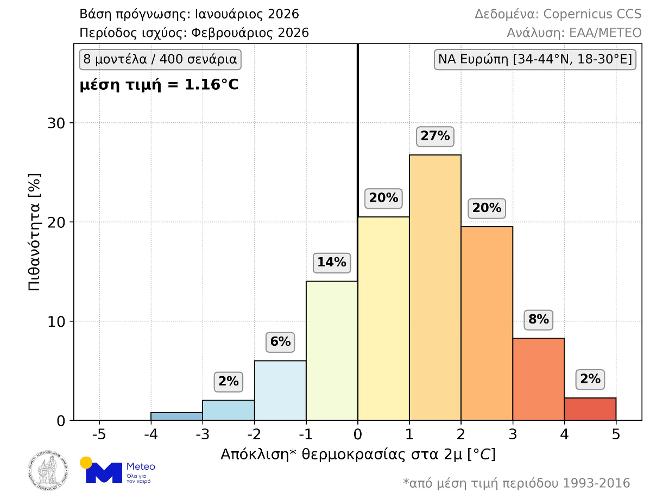 Θερμότερος του κανονικού αναμένεται να είναι ο ερχόμενος Φεβρουάριος στην ΝΑ Ευρώπη (συμπεριλαμβανομένης της Ελλάδας) σύμφωνα με τις μακροπρόθεσμες προγνώσεις που εκδόθηκαν στις αρχές Ιανουαρίου. Όπως φαίνεται στο παρακάτω γράφημα (Εικόνα 1), σύμφωνα με το 77% των διαθέσιμων σεναρίων η μέση θερμοκρασία Φεβρουαρίου θα είναι υψηλότερη από τα κανονικά για την εποχή επίπεδα (περίοδος αναφοράς: 1993-2016). Συγκεκριμένα, η πιθανότητα για θετικές αποκλίσεις μεταξύ 0 και 1°C, μεταξύ 1 και 2°C και άνω των 2°C είναι 20%, 27% και 30% αντίστοιχα. Οι πιθανότητες για αρνητικές αποκλίσεις μεταξύ 0 και 1°C και άνω του 1°C είναι 14% και περίπου 9% αντίστοιχα. Η μέση τιμή των 400 σεναρίων είναι +1.16°C.