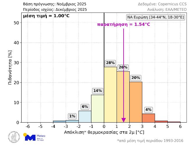 Όσον αφορά τον περασμένο Δεκέμβριο, η μέση θερμοκρασιακή απόκλιση στην ΝΑ Ευρώπη ήταν +1.54°C, ενώ η μέση τιμή όλων των σεναρίων της μακροπρόθεσμης πρόγνωσης που εκδόθηκε τον Νοέμβριο του 2025 ήταν +1.0°C. Όπως φαίνεται στο παρακάτω γράφημα (Εικόνα 3), το μέγεθος της απόκλισης που παρατηρήθηκε είχε πιθανότητα 26% και ήταν το 2ο πιθανότερο πεδίο τιμών στην μακροπρόθεσμη πρόγνωση.